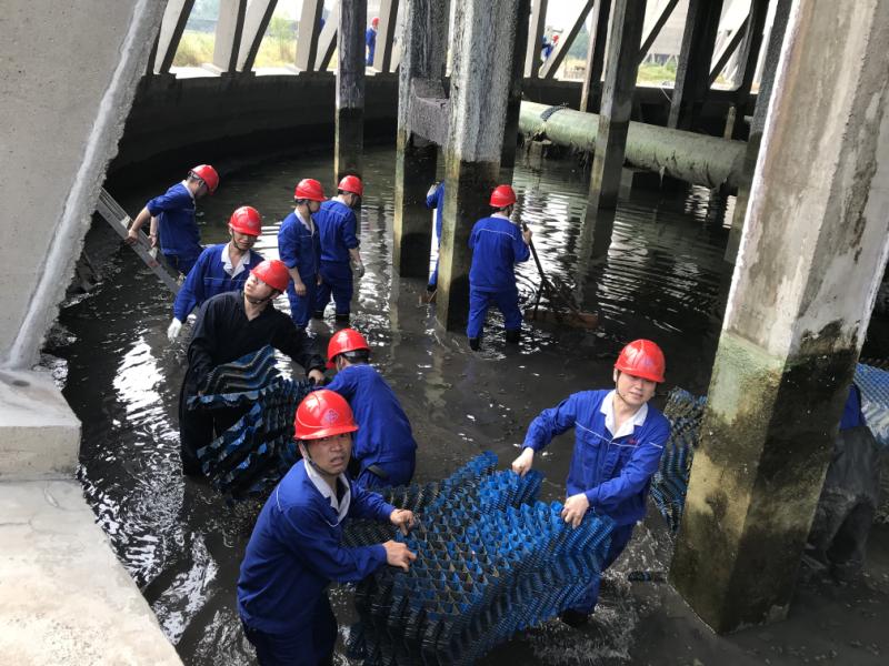 活動中,黨員們戴著安全帽、穿著雨鞋下到近半米深的淤泥中,對淤泥上成堆的破損填料進(jìn)行清理。黨員們兩人一組,一起將淤泥中的廢填料抬到2米高的水泥地面,填料上的淤泥和污水濺到黨員們的臉上、胳膊上、衣服上,池底的污水倒灌進(jìn)雨鞋,不一會大家個個都成了泥人。大家不顧臟累,雜物清理完成后,大家合力用木推子把淤泥進(jìn)行搬運(yùn),由于淤泥又厚又沉,汗水浸濕了黨員們的衣背。最后,大家又將規(guī)整后的淤泥裝入袋子,整齊碼好,用起吊設(shè)備將淤泥吊裝運(yùn)走。