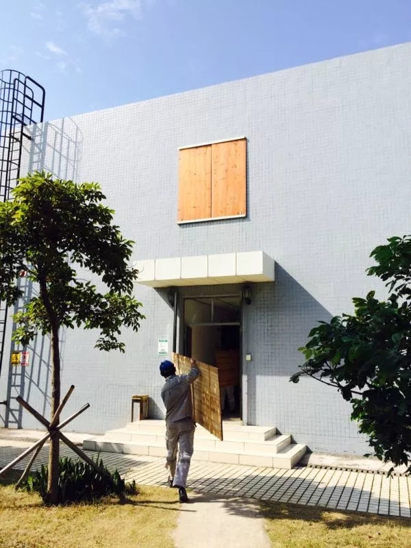 ▲臺(tái)風(fēng)登陸前夕,物業(yè)員工加固門窗,防止門窗損壞。