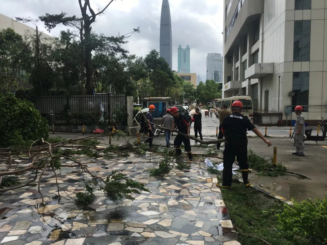 ▲臺(tái)風(fēng)后,福田分公司物業(yè)員工迅速清理瑋鵬花園內(nèi)被臺(tái)風(fēng)吹倒的樹木,保障住戶出行。