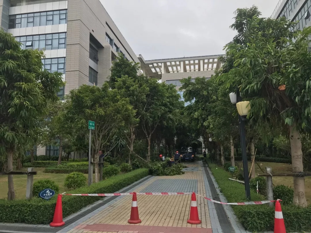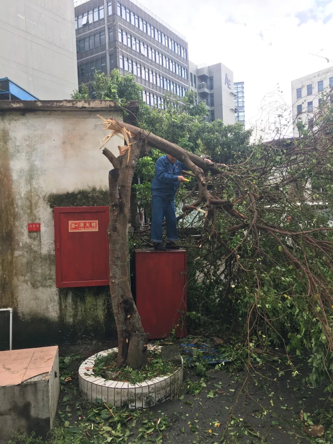▲臺(tái)風(fēng)后,陽江分公司物業(yè)員工迅速開始清理被臺(tái)風(fēng)吹倒的樹木,保障員工出行。