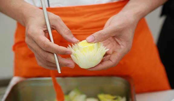 “物盡其用”——利用白菜梗雕刻成菊花,體現“厲行節約,反對浪費”社會新風尚
