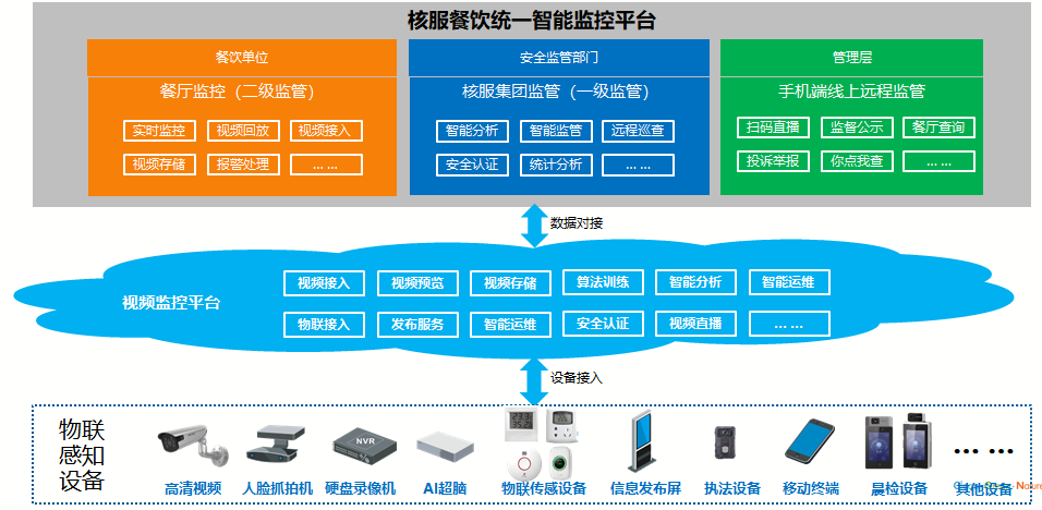 中廣核服統(tǒng)一智能監(jiān)控系統(tǒng)充分運用大數據、云架構、AI智能等先進技術,并結合AI視頻圖像算法科學分析加定制開發(fā)。在功能上,實現(xiàn)餐廳監(jiān)控畫面實時監(jiān)測、回看、自動識別餐廚風險并自動預警、支持遠程指揮和豐富直觀報表統(tǒng)計分析展示等。在管理上,實現(xiàn)管理人員通過手機APP對餐廚人員行為進行全面規(guī)范和安全管控。