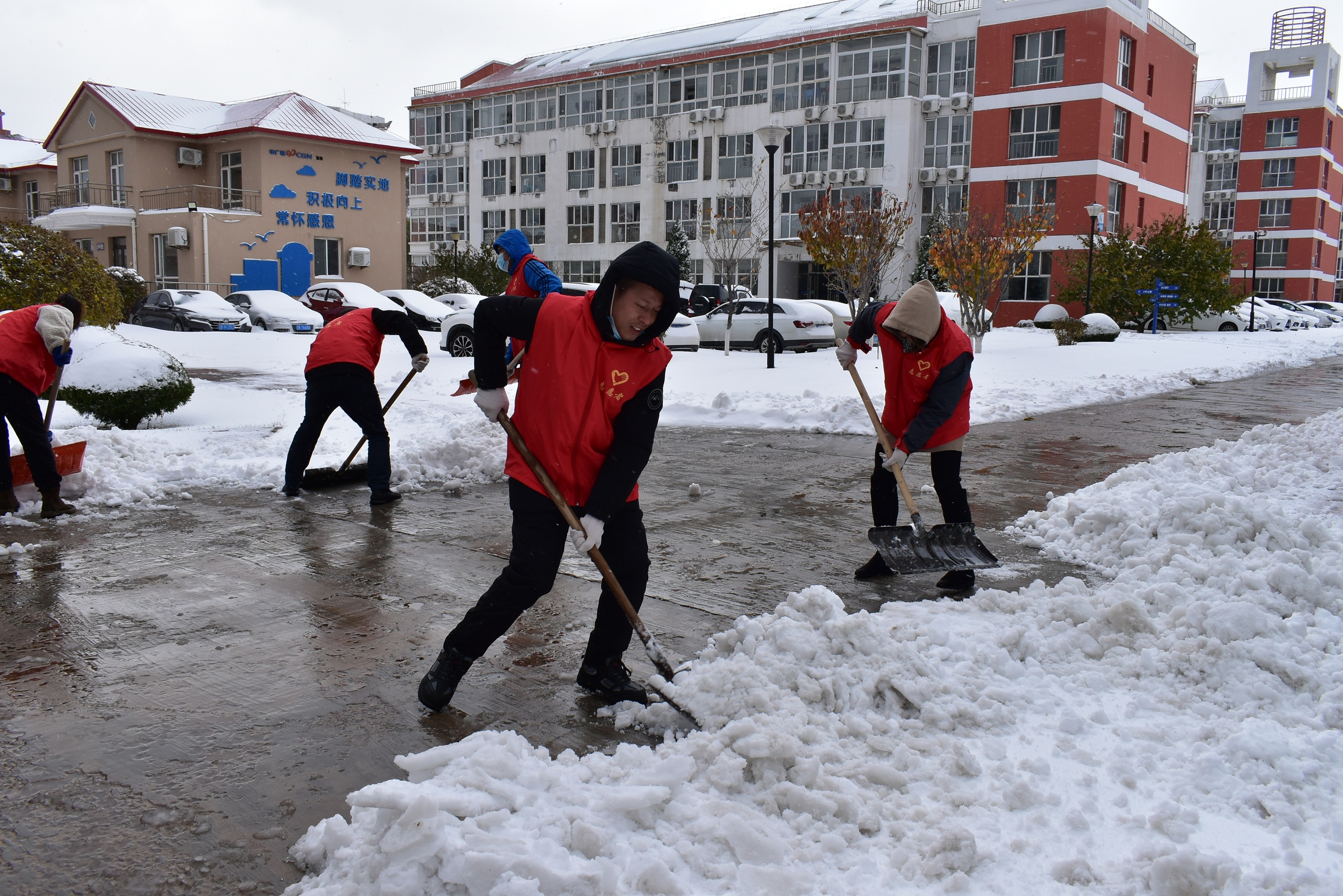 此次降雪,積雪最高深度可達50厘米,以及8級以上的瞬時大風,給員工出行及工作帶來不便。中廣核服大連分公司全員齊行動,黨員充分發揮先鋒模范作用,連夜奮戰,積極參加到除雪保暢通中,最大限度的減少因降雪對員工出行造成的影響,保障道路暢通。