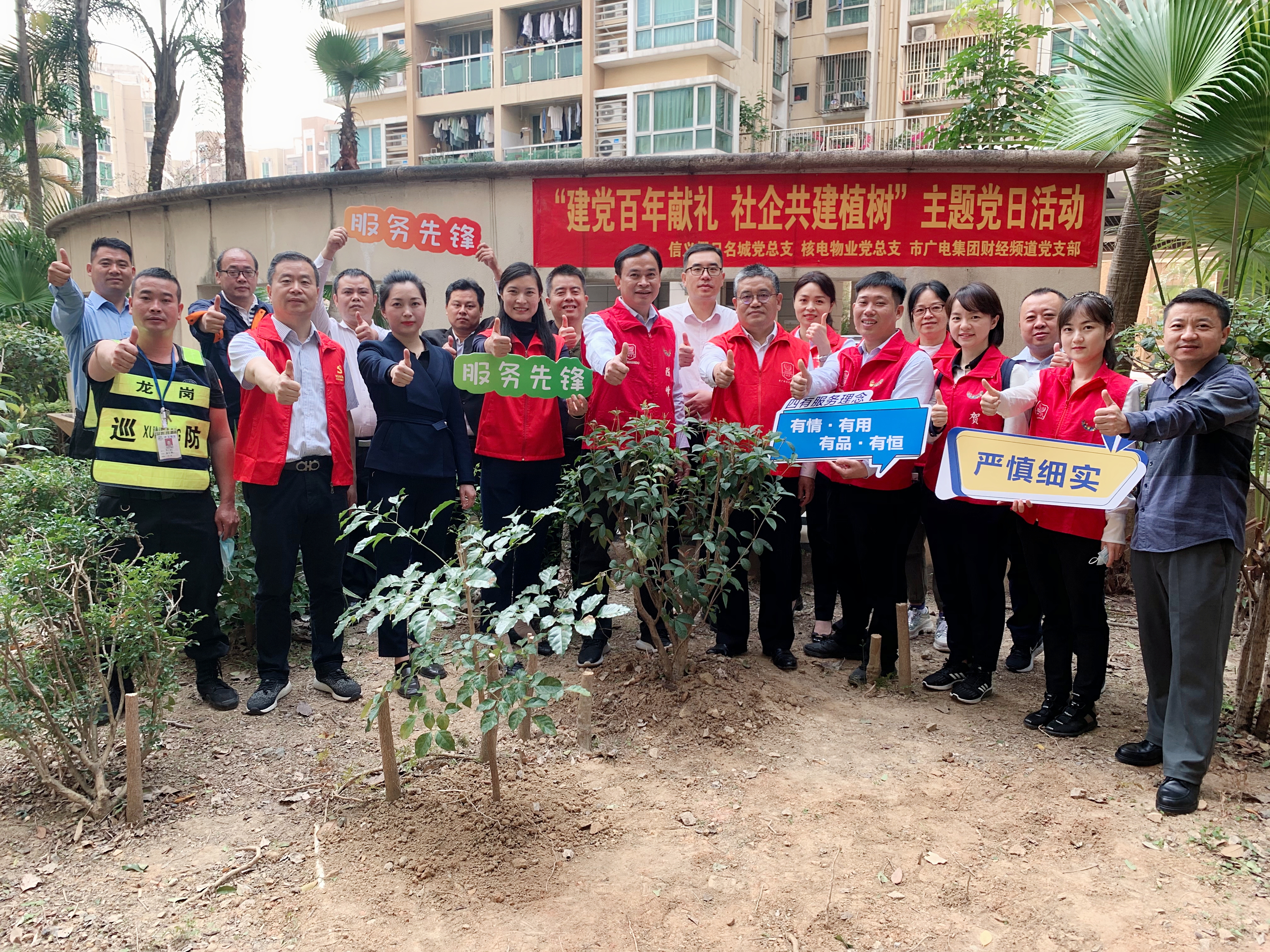 隨后,物業公司黨總支、信義假日名城黨總支及深圳市廣電集團財經頻道黨支部在信義假日名城聯合開展了“建黨百年獻禮,社企共建植樹”主題黨日活動。30余名志愿者參加了本次義務植樹活動,為小區栽種下50顆小樹苗,用實際行動踐行“綠水青山就是金山銀山”的發展理念。